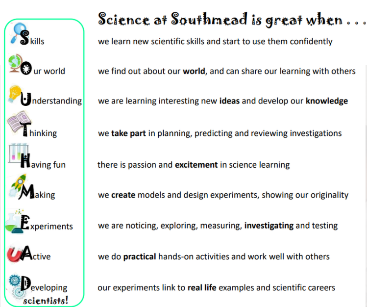 At Southmead Primary School we have designed our Science Curriculum to enable children to learn confidently through enquiry, exploration, investigation and discovery. As a result, our Science Curriculum helps them to develop a deeper understanding of the world in which they live. Our